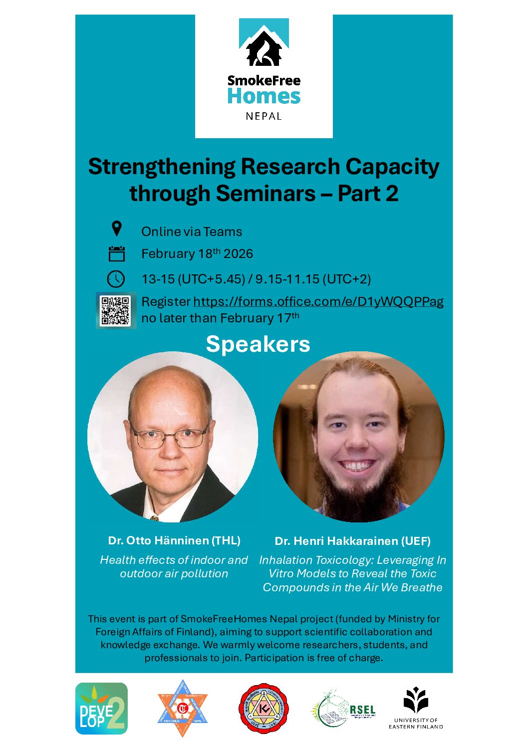 SmokeFreeHomes Nepal (Technological and socio-economic solutions to reduce indoor air pollution in Nepal) project will clarify the levels of indoor air pollutants, estimate emission factors and SOA potential, aim to reduce the exposure for indoor air pollutants and produce information for the assessment of health and climate effects and for Nepalese emission database and energy policies. The project is part of the Academy Programme for Development Research DEVELOP2.