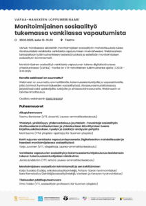 Sosiaalityön tutkimuksen päivät, työryhmä ”Monitoimijaisen sosiaalityön mahdollisuudet ja haasteet rikostaustaisten henkilöiden tukemisessa digitalisoituvassa yhteiskunnassa” (Mari Suonio, Tarja Juvonen). Linkki työryhmiin.