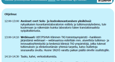 13:00-14:10 Webinaari: UEF/PSHVA Kliininen TKI-toimintaympäristö –hankkeen järjestämä webinaari – webinaarissa esitellään mm. alueellista tutkimus- ja innovaatioyhteistyötä ja keskeisiä kliinisiä TKI-ympäristöjä, jotka tukevat tutkimuksen ja elinkeinoelämän yhteisiä tarpeita. Huone SN205 varattu paikan päällä oleville osallistujille.