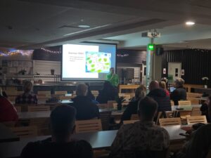 Ohessa kuva, jossa Johanna Puukilainen esittelee toimintaa huoltajayhteisölle.